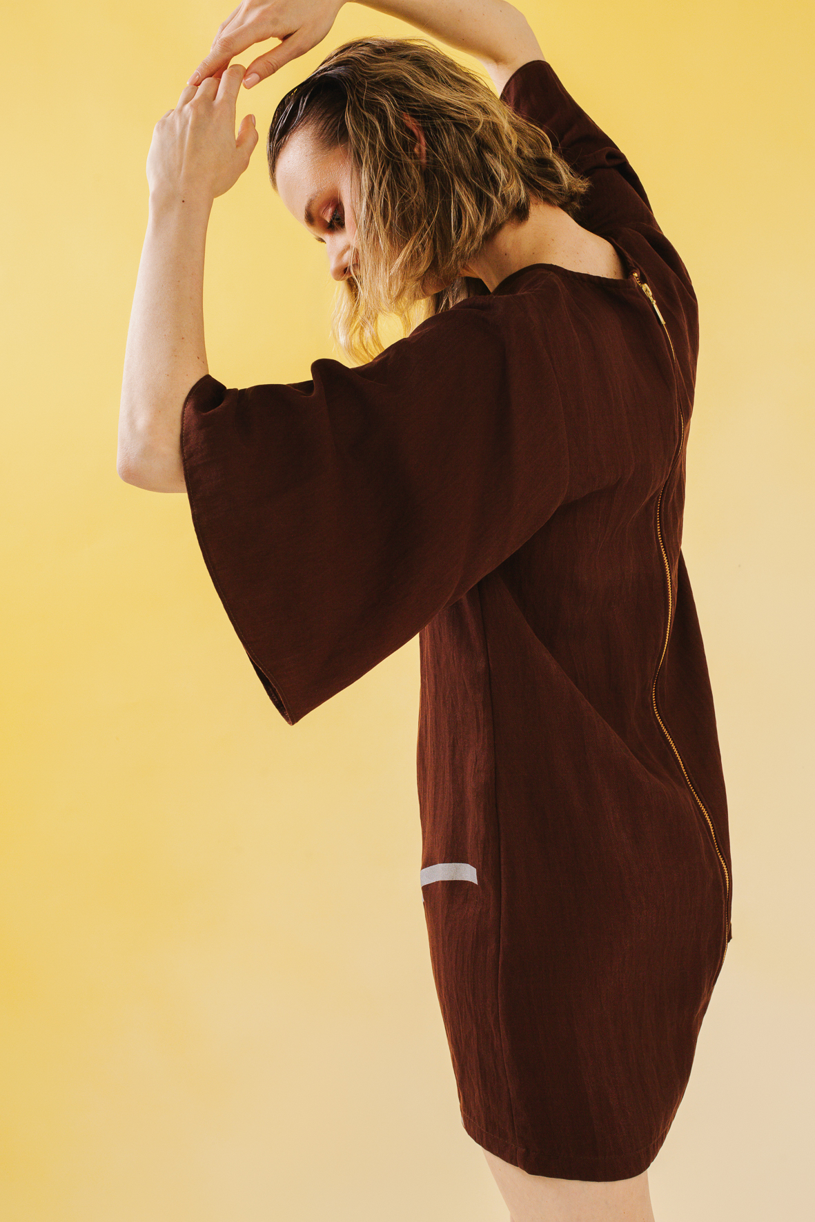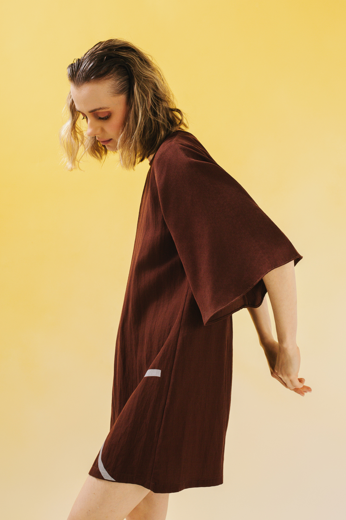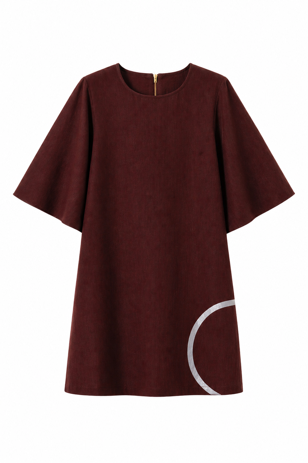 El Ground Dress tiene mangas tipo campana y silueta en A de caída fluida, diseñada para favorecer diversos tipos de cuerpo. El print plateado hecho a mano en la parte forntal conecta con nuestro amor por la geometría.