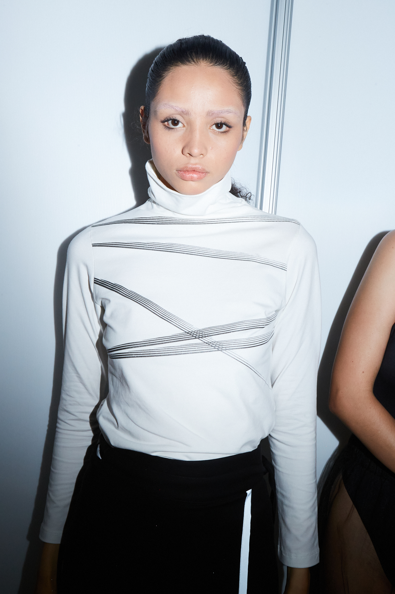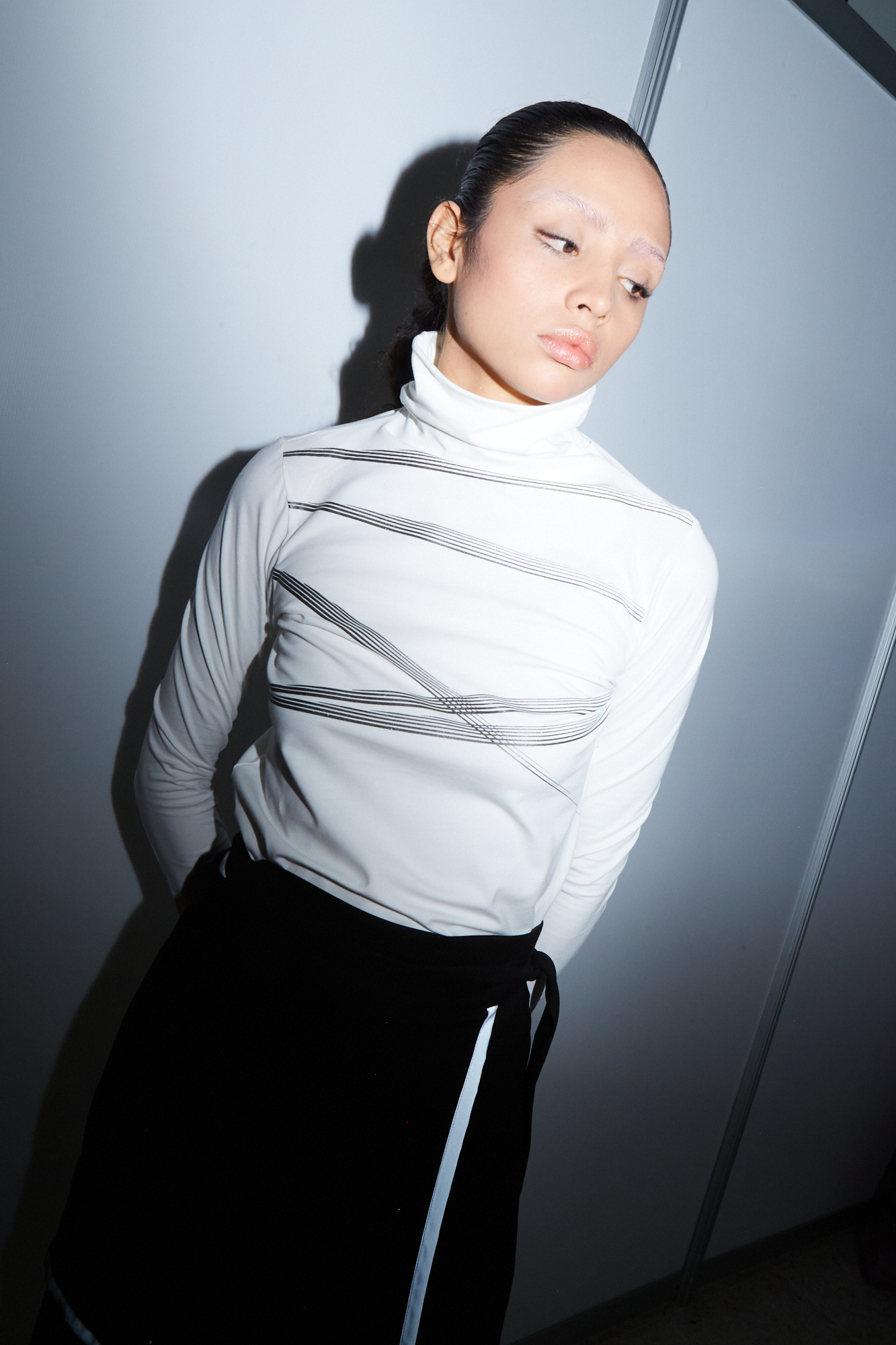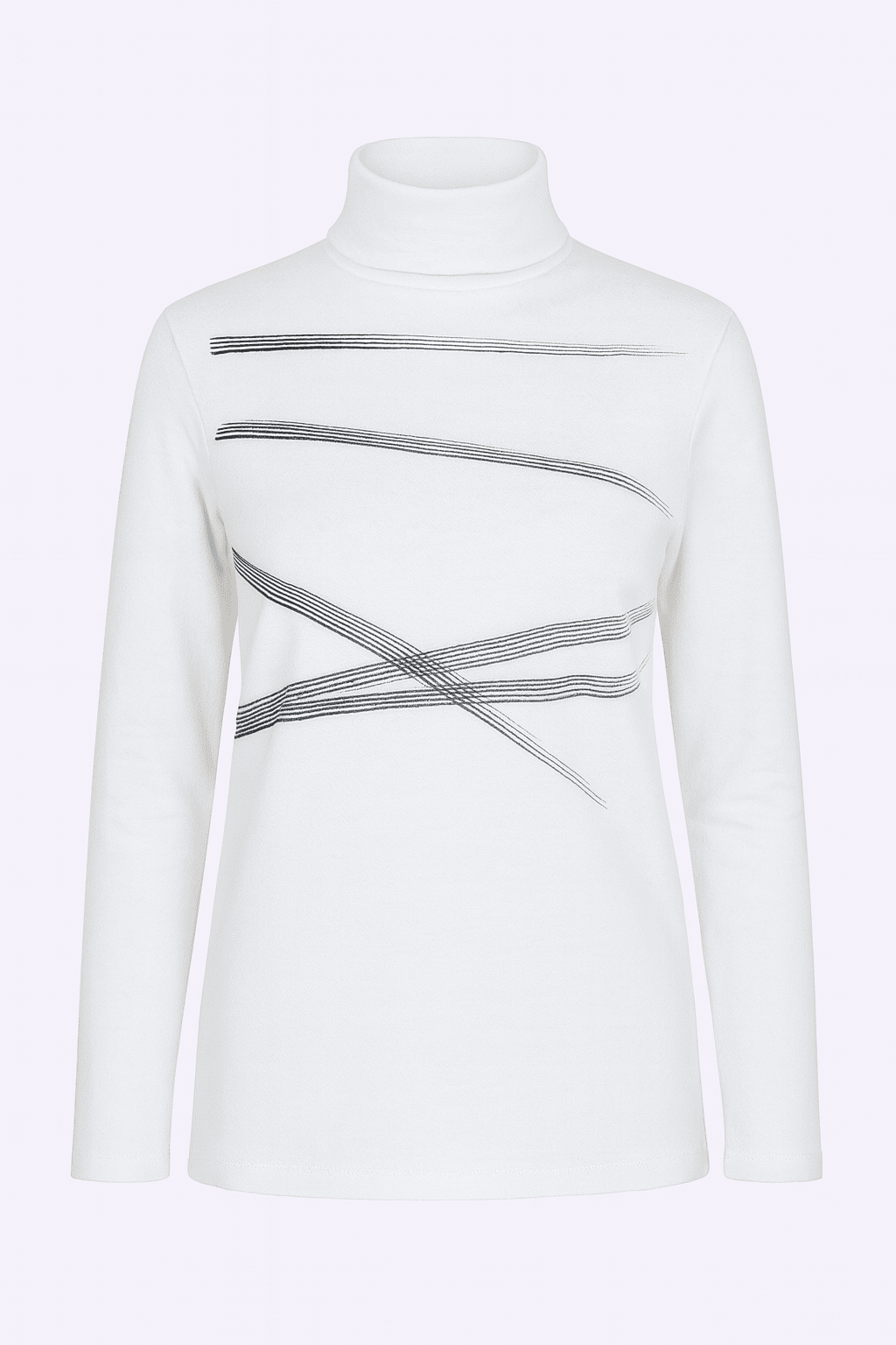 Our organic fiber turtleneck has an arty front print and beautiful fit. With long sleeves.
