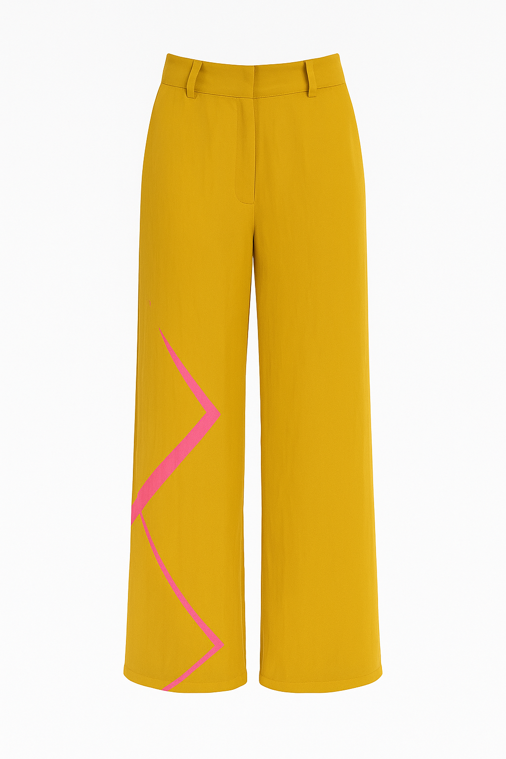Discover our mid-waist yellow pants, designed to flatter every body shape with a sleek, versatile fit. Featuring bold pink triangle prints on the front, these geometric accents create a striking contrast that brings vibrant energy to the look. With practical lateral pockets and a tailored silhouette, this piece blends playful design with everyday functionality.